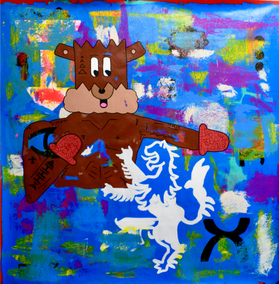 Known simply as “Hokett,” the Philadelphia native has always been about “creating [his] own language” through his eye-catching “calligraffiti” pieces. Painting abstracted glyphs against swatches of vibrant colors, his current work combines pop culture symbolism with his bear-like “PAWS” characters, who participate in exceedingly ordinary activities like playing football, dressing up as Batman or watching television with their family on a Sunday.
